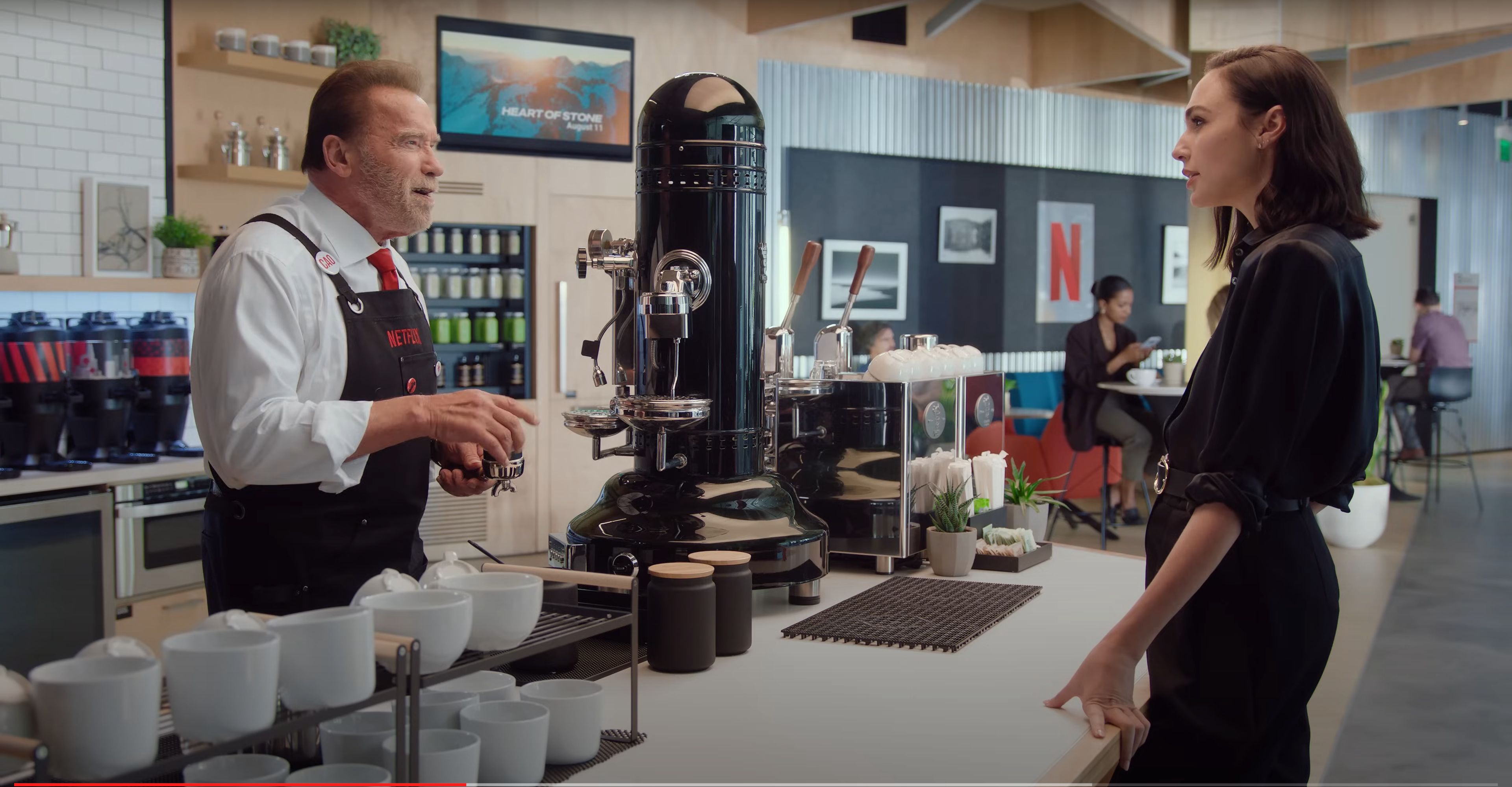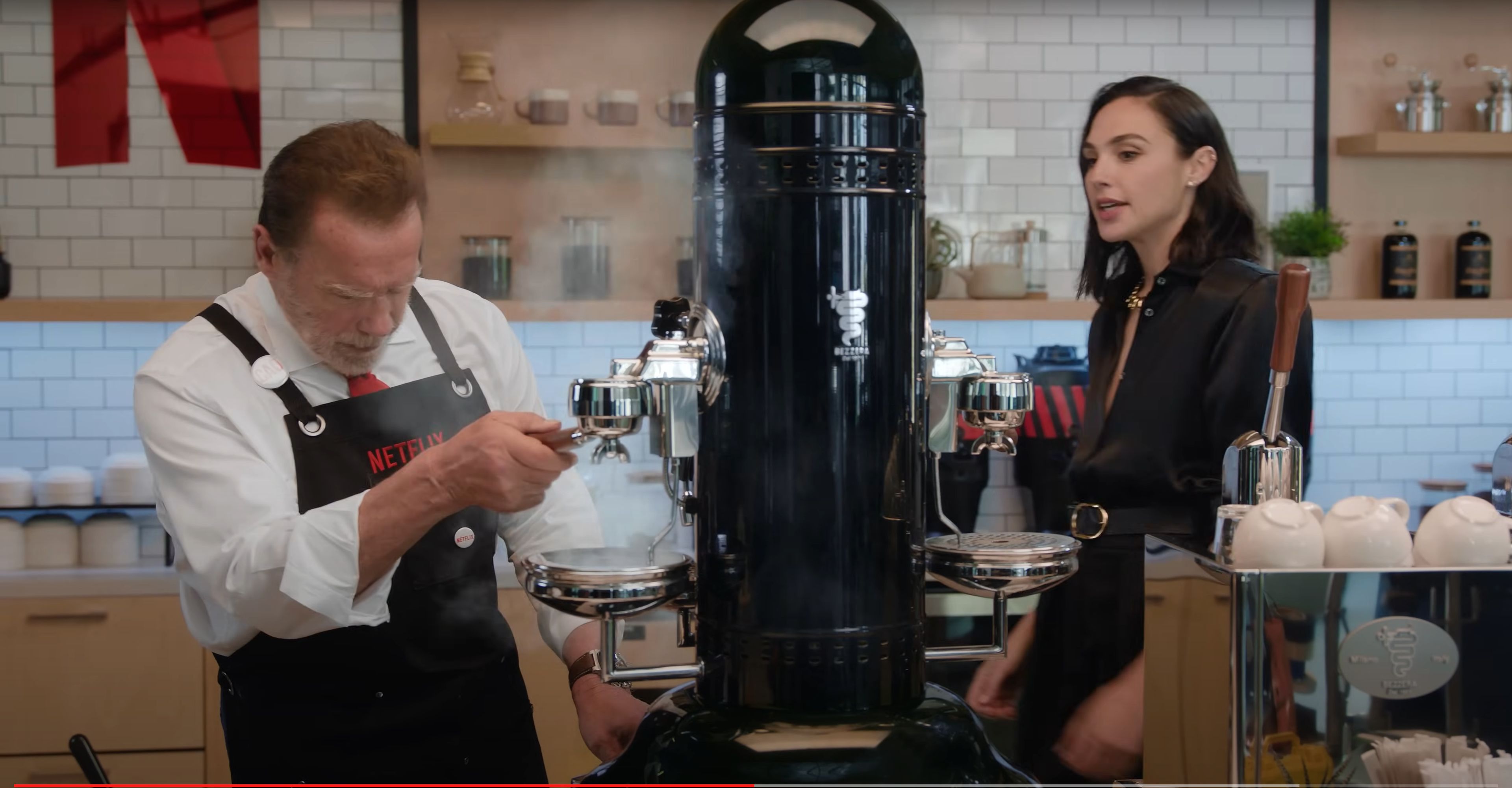 Gal Gadot serving Arnold Schwarzenegger a cup of Caffe Latte from a Bezzera Verticale Black Eagle 2 Group Coffee Machine